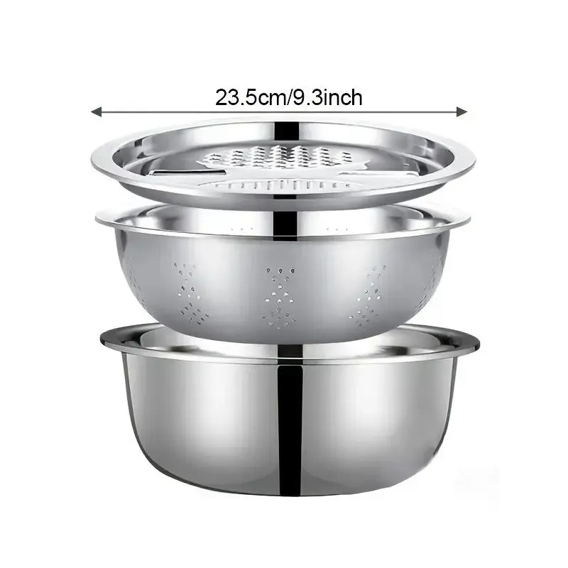 201 Stainless Steel 3-in-1 Multi-functional Kitchen Basin Set, Vegetable Grater Cutting Tool, Drain Basket, Rice Washing Colander, Shaving & Washing Bowl 3PCS Kit