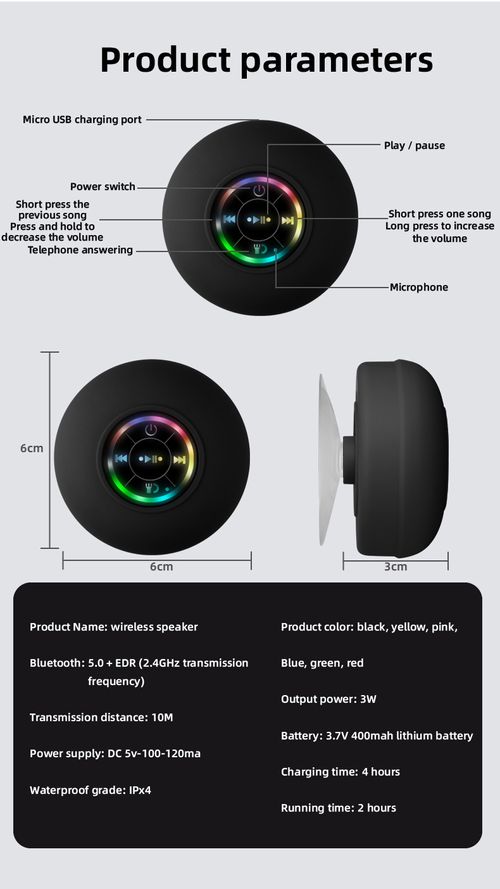 Waterproof Black Bluetooth Speaker with Large Suction Cup & LED Lights, Portable Shower Speaker for Bathroom & Outdoor
